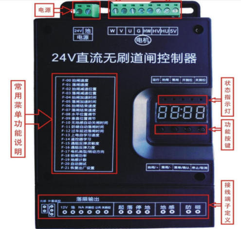 4) 機芯采用直流無刷電機,輸出扭矩大、體積小,通過控制 器可實現速度任意調節,落桿與抬桿到位時實現減速緩沖,使閘桿平穩到位。