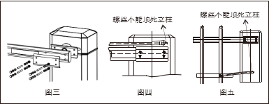 曲臂閘桿及柵桿閘桿再按圖四, 圖五方式按裝好拉桿上的連接頭, 并注意調節好拉桿長度及立柱長度, 使曲臂桿在落桿位置是水平的, 柵欄桿的小豎桿是豎直的, 拉桿與閘桿是平行的, 調節好后, 拼緊拉桿兩端的螺母, 然后將連接頭上的十字螺釘擰到立柱的安裝槽內, 確保起落桿時, 連接頭能順暢的轉動( 連接頭上的十字螺絲頂死立柱, 會出現轉不動的現象);